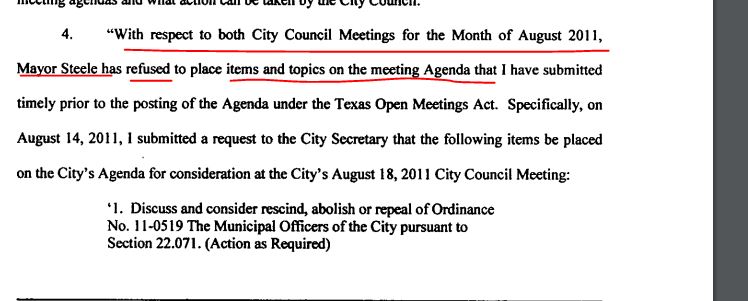 The corruption is evident when the City Council of Wilmer sues Jeff Steele for withholding the agenda. You can see someone does not like when things don't go his way