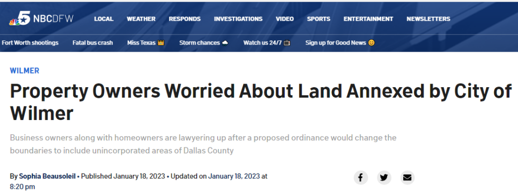 NBC5 News Article: https://www.nbcdfw.com/news/local/property-owners-worried-about-land-annexed-by-city-of-wilmer/3173430/