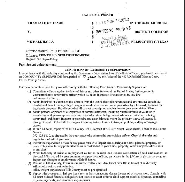 Michael Halla, Ex-City Attorney, was convicted on 2 counts of 3rd degree CRIMINALLY NEGLIGENT HOMICIDE in the 443rd Court of Ellis County.